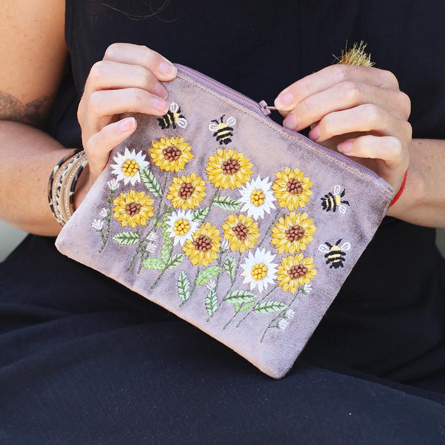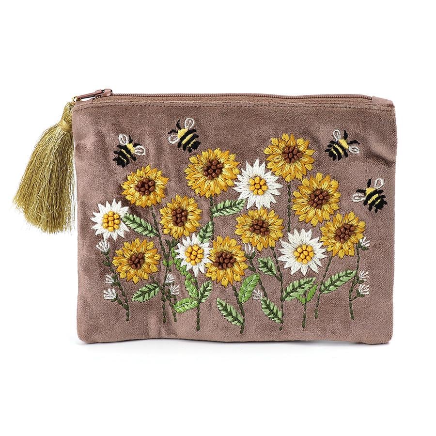 Bring a touch of nature-inspired charm to your everyday essentials with this beautifully embroidered bee and sunflower velvet pouch. Featuring vibrant sunflowers, delicate white blooms, and charming bee detailing, this pouch blends practicality with timeless countryside elegance.