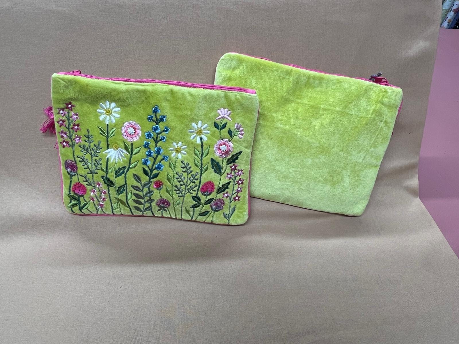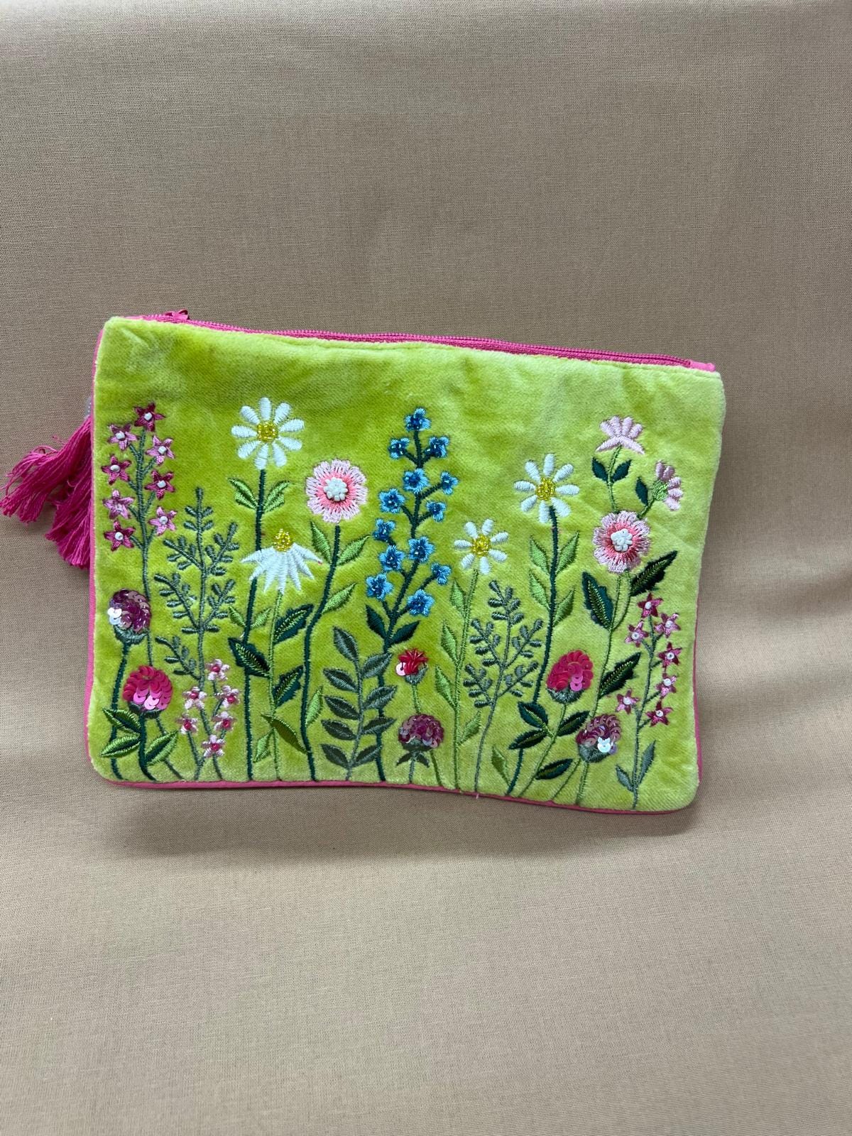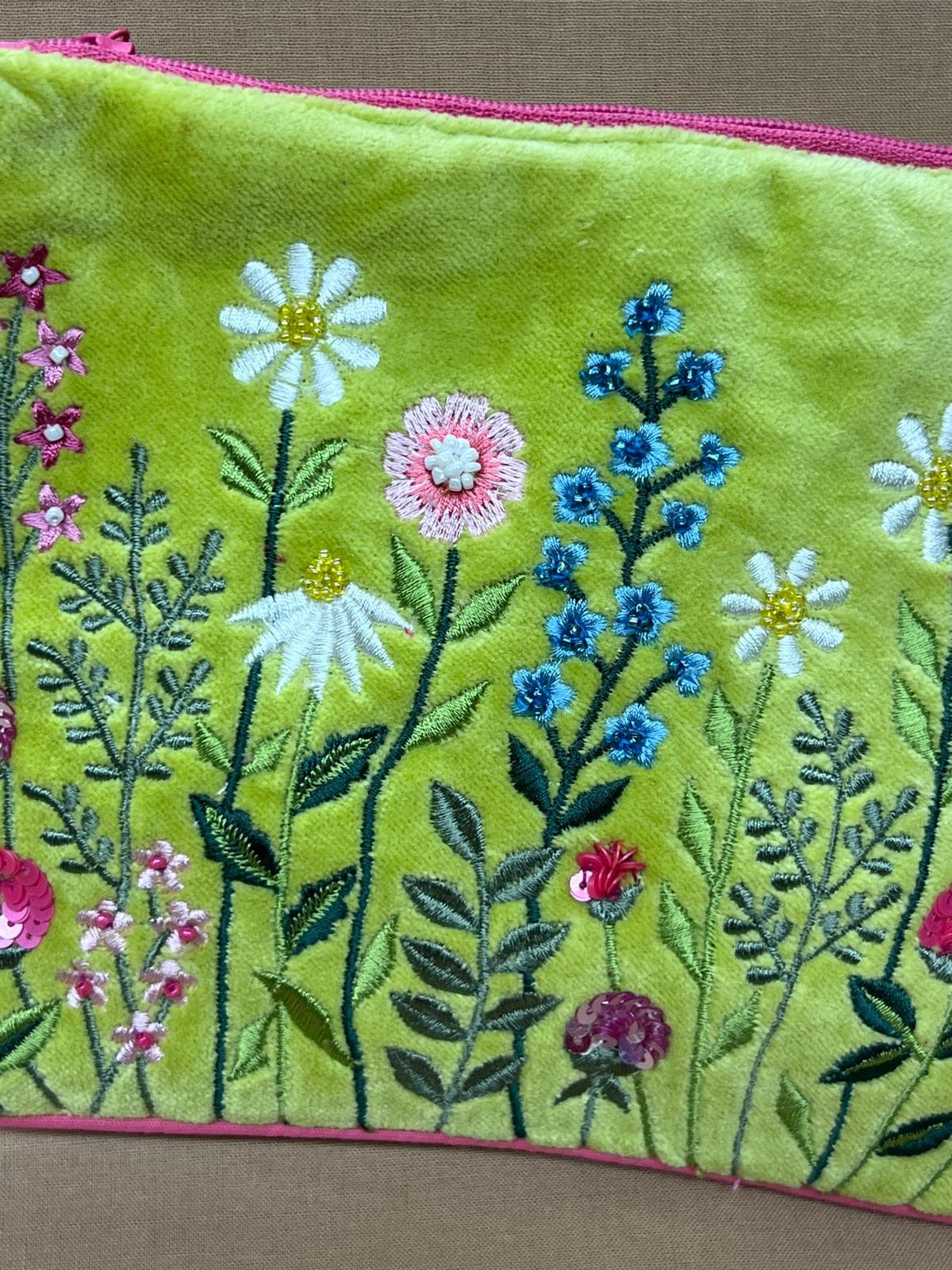 Brighten your everyday essentials with this vibrant lime green floral embroidered velvet pouch. Featuring colourful wildflower embroidery with delicate sequin accents, this eye-catching pouch combines practical storage with cheerful botanical charm.