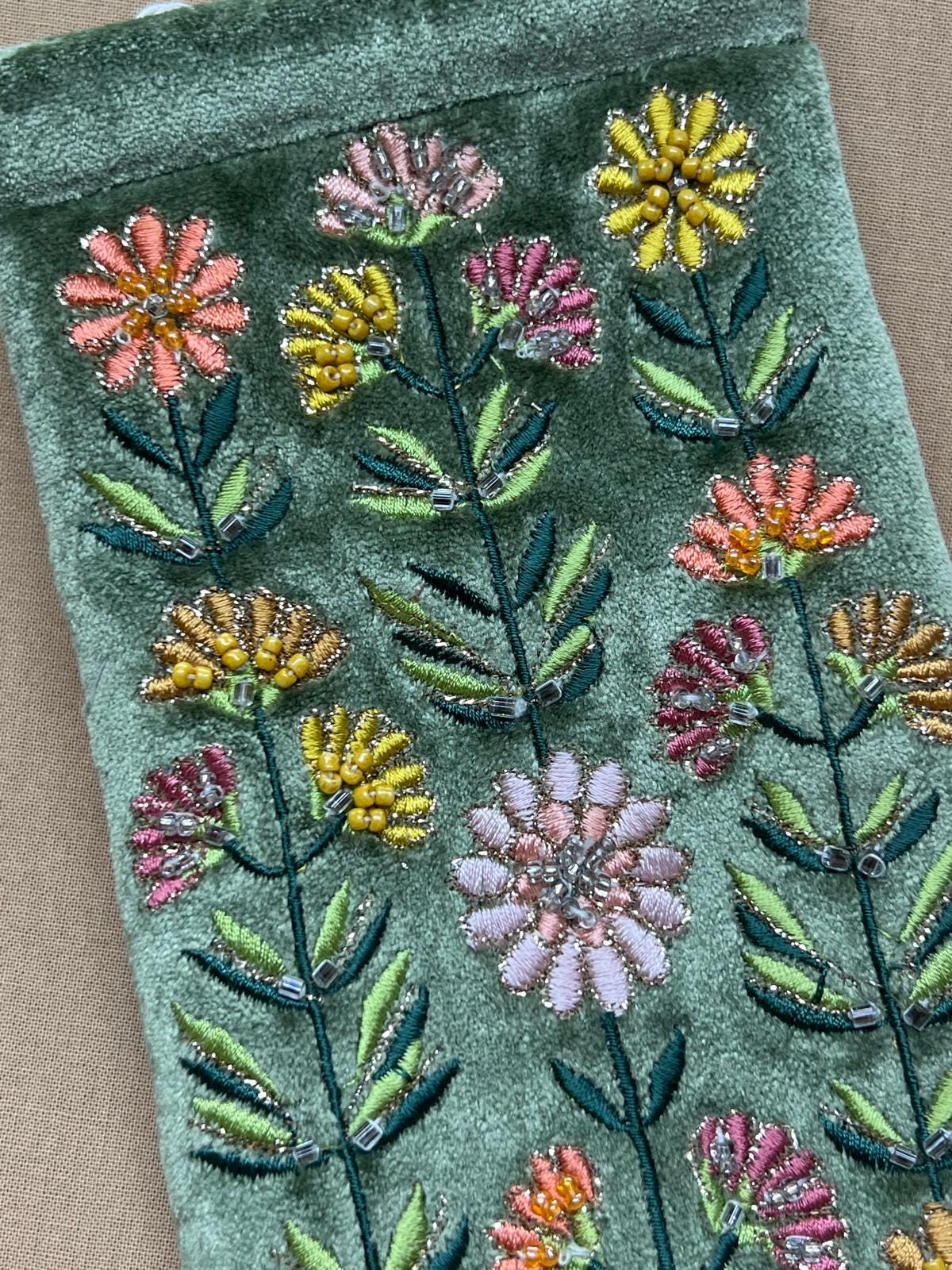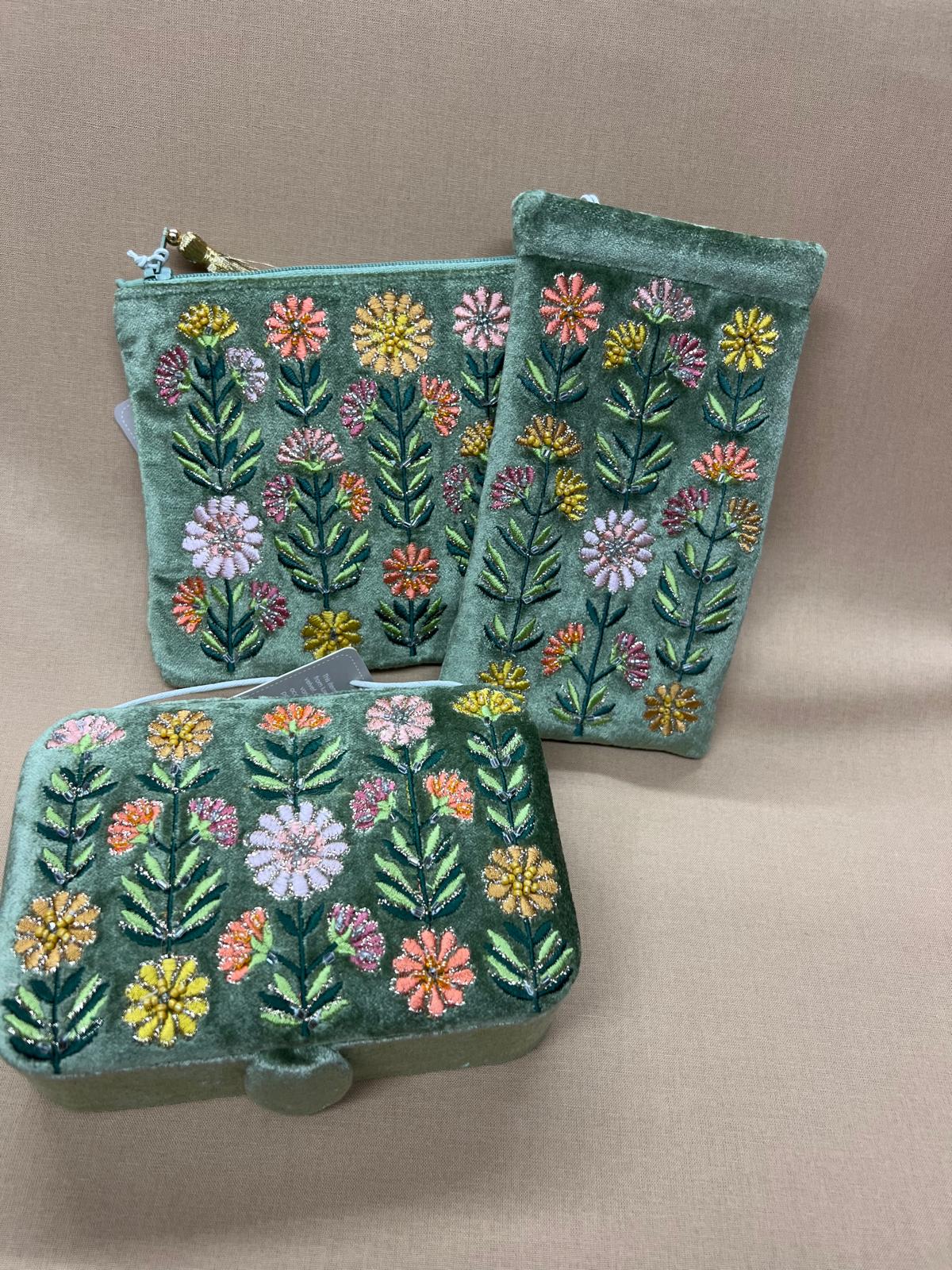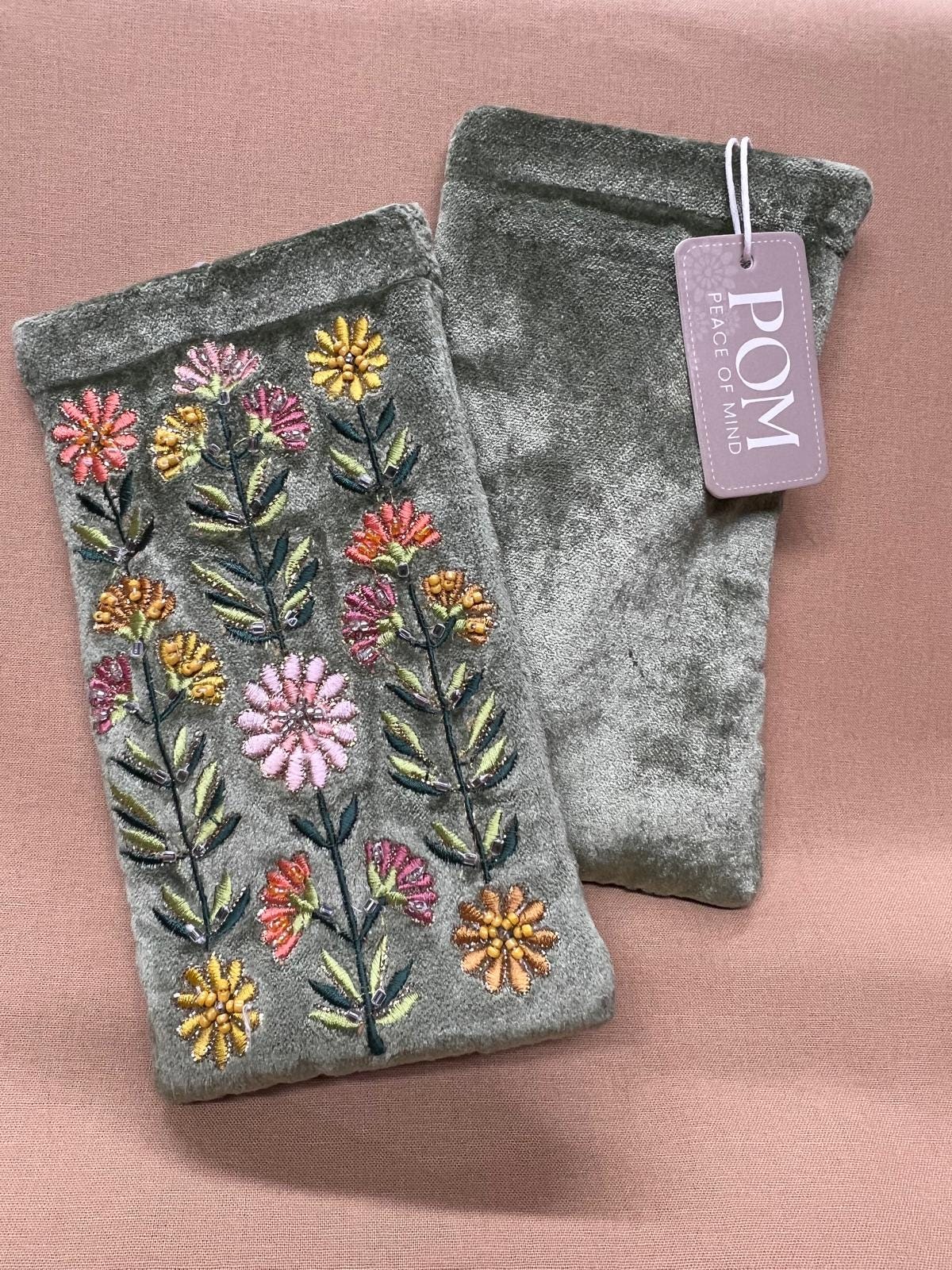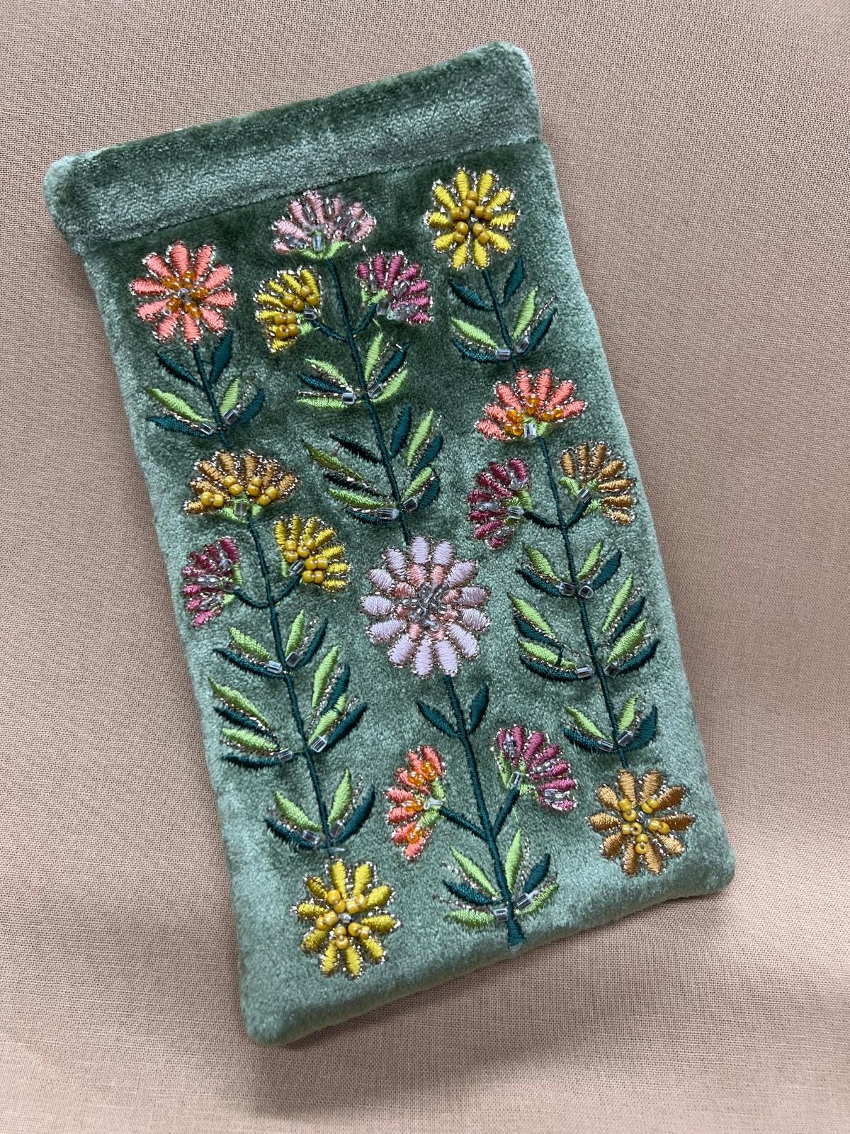 Protect your glasses in style with this beautifully crafted sage green embroidered glasses case. Featuring delicate wildflower embroidery and subtle beaded detailing on a soft velvet-style fabric, this case combines elegance with everyday practicality.