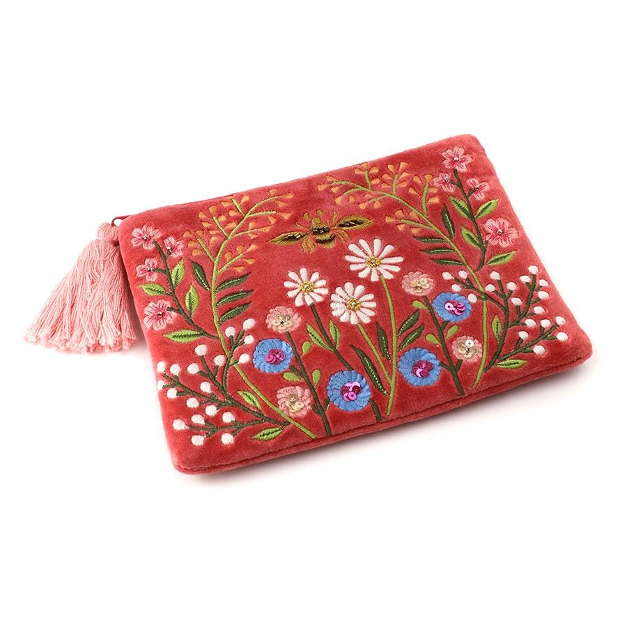 Add charm and elegance to your everyday essentials with this beautifully embroidered coral bee & daisy velvet pouch. Featuring delicate wildflowers, soft botanical detailing, and a charming bee motif, this pouch blends nature-inspired beauty with practical storage.