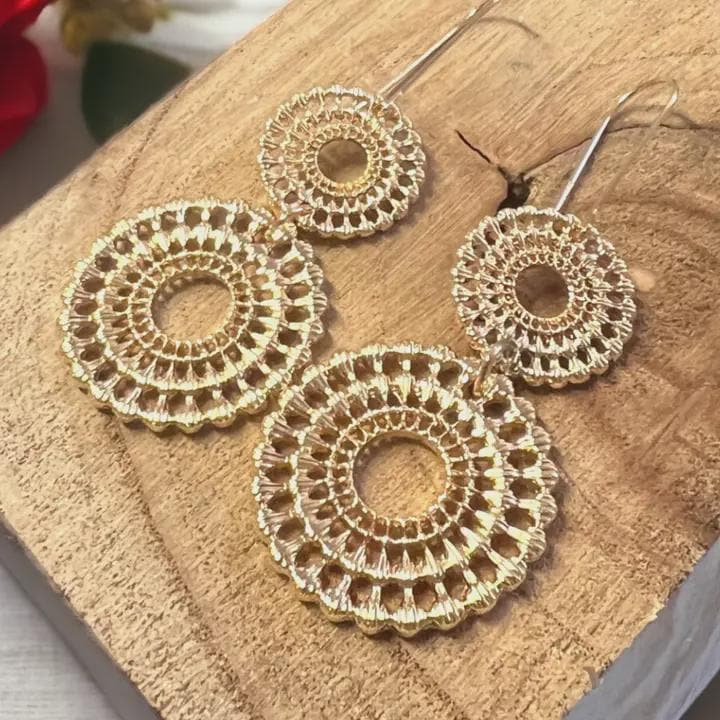 Add a touch of elegance and artistry to your look with these handmade gold crochet lace earrings. Carefully crafted with intricate lace detailing, these stunning circular earrings create a delicate yet bold statement. Their lightweight design makes them comfortable to wear all day while still standing out as a unique accessory.