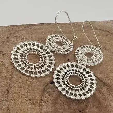 These handmade crochet lace earrings bring delicate craftsmanship and timeless elegance together. Featuring an intricate circular lace pattern in a beautiful silver tone, these earrings create a stylish statement while remaining lightweight and comfortable for everyday wear.