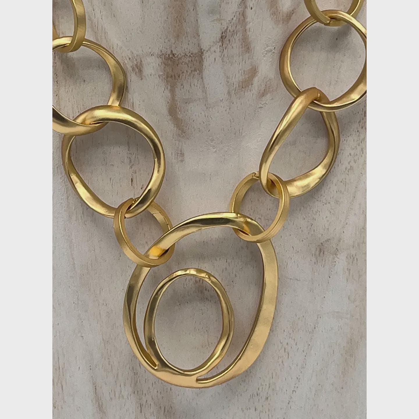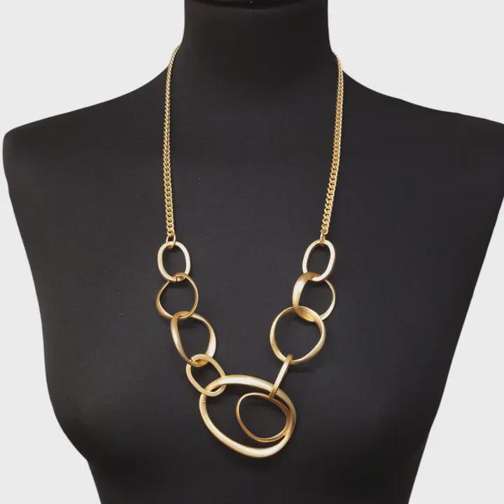Make a bold and stylish statement with this modern gold link necklace. Designed with a series of elegant circular links and a striking oversized ring pendant, this necklace brings a contemporary geometric look that instantly elevates any outfit.