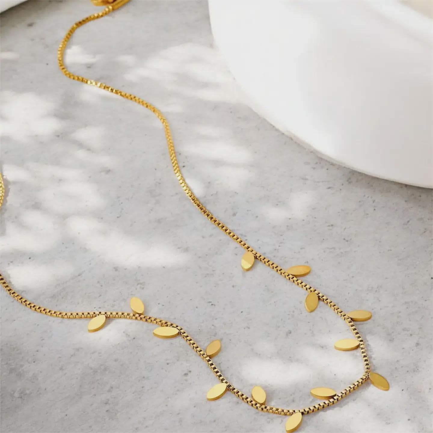 Add a delicate and elegant touch to your look with this tarnish resistant gold leaf necklace. Designed with a beautiful alternating leaf pattern, this minimalist necklace brings a subtle nature-inspired style that is perfect for everyday wear or layering with other pieces.