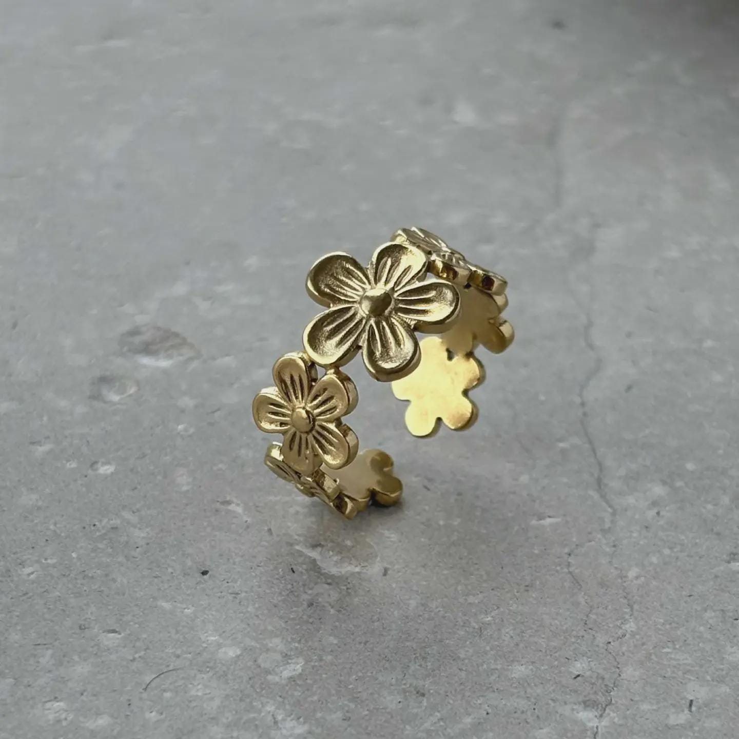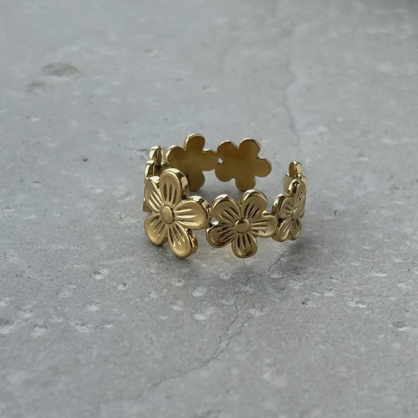 This gold floral ring is a beautiful and feminine piece that adds a subtle yet eye-catching detail to any outfit.